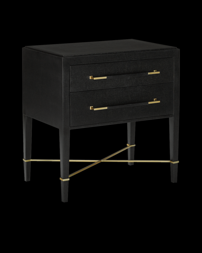 The Verona Black Nightstand is darkly handsome covered in black lacquered linen with metal detailing in a champagne finish. The stretchers on this minimalist nightstand bring it its flair.