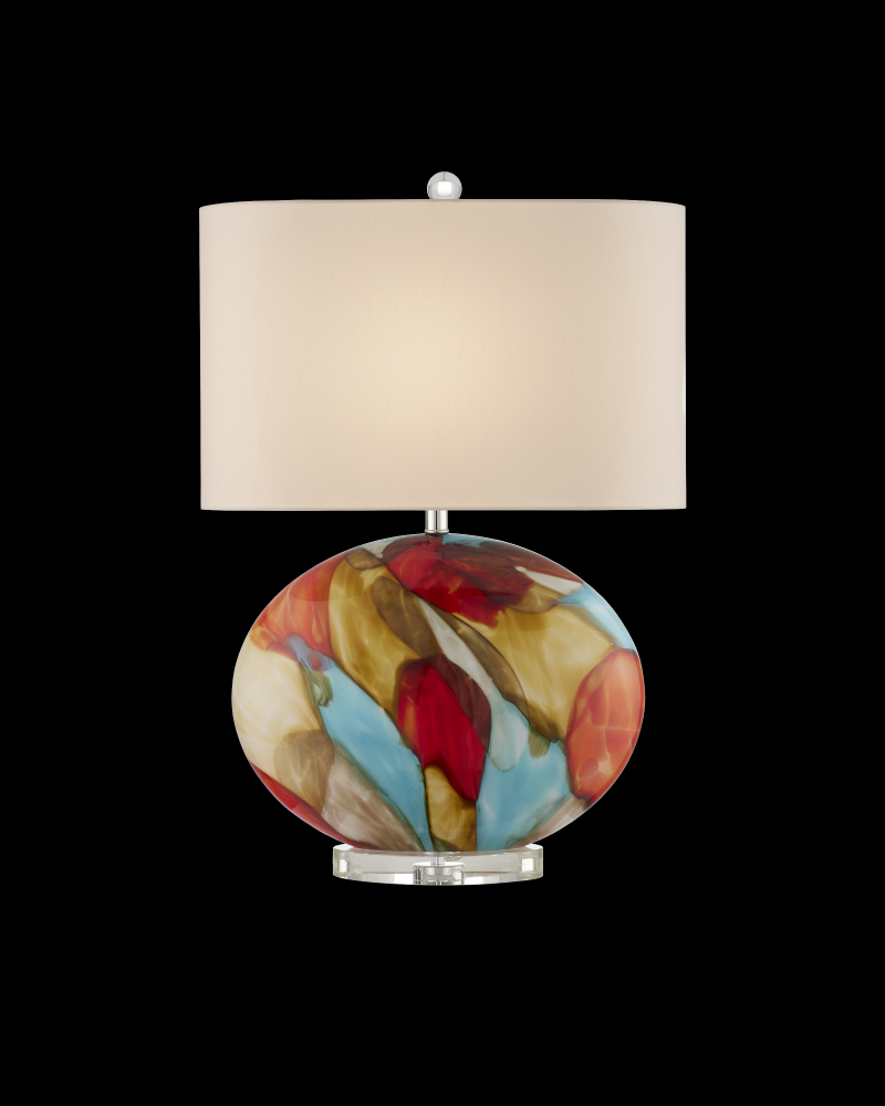 The Vivid Table Lamp lives up to its name with its swirling swaths of bright colors painted on its lozenge-shaped body. The multi-colored lamp glows even before it is fitted with an optic crystal base and finial, and polished nickel hardware. A polished design detail is how the shade is elongated in the same scale as the body and has rounded corners. The narrowness makes the lamp perfect for a spot where a fixture needs to sit close to the wall to free up tabletop space.