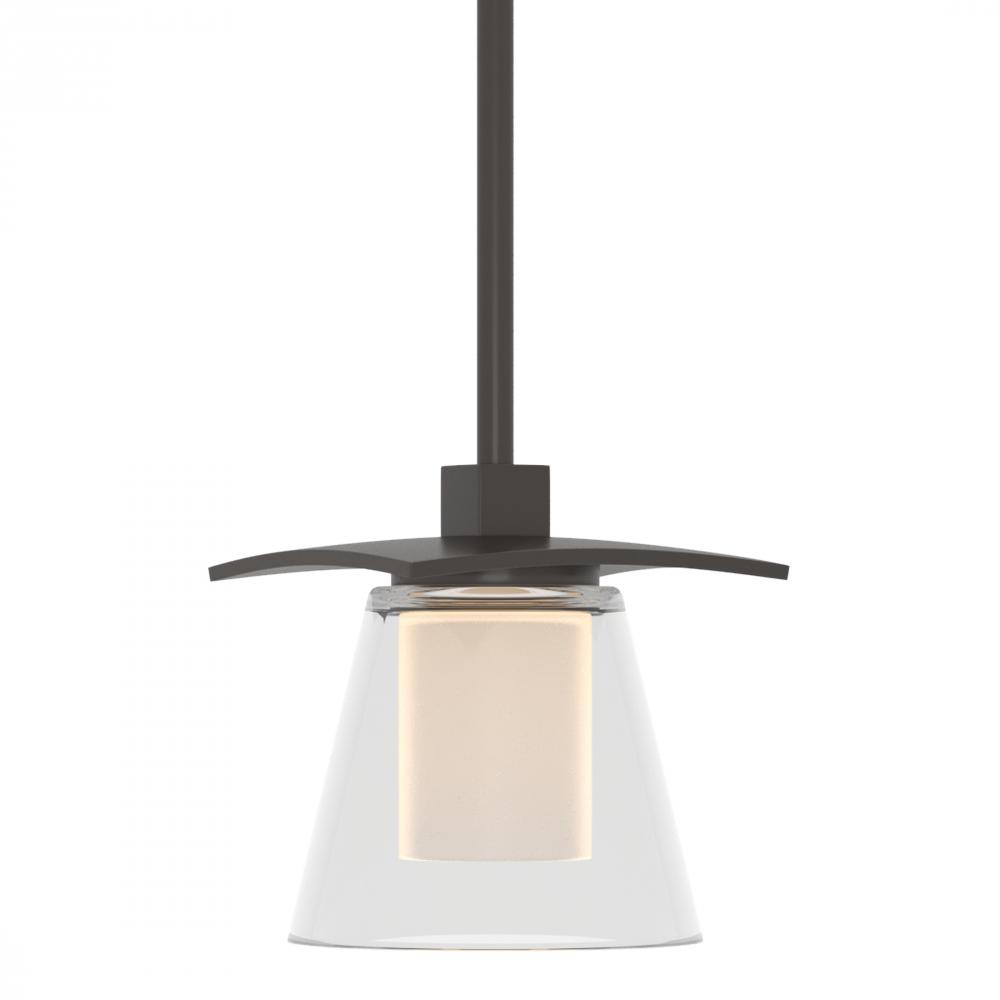 The Wren Mini Pendant's design element is simple. A steel rectangle with slightly curled edges shape bands of light which stream from the narrower sides to decorate the ceiling while the open end of the glass directs light for practical needs.